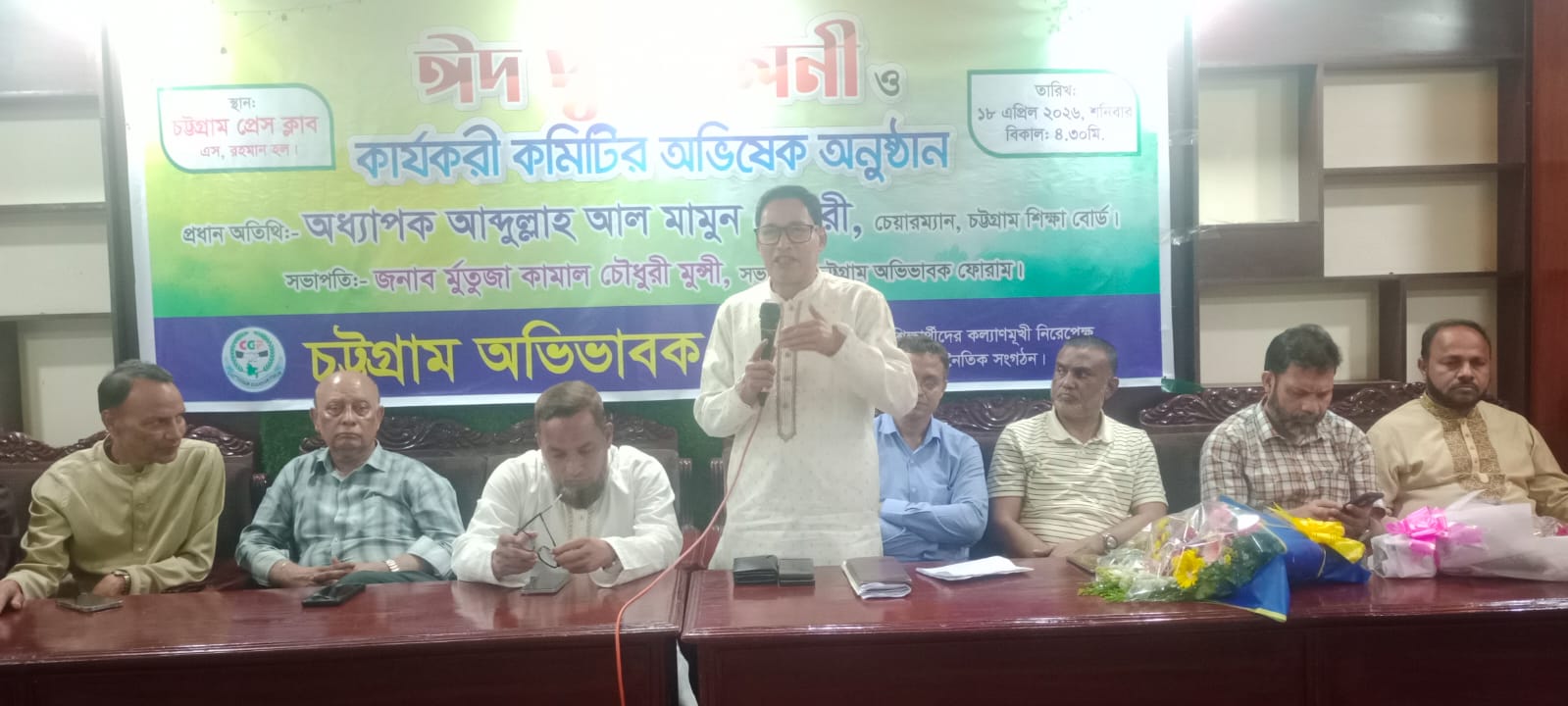নিউজ:- গত ১৮ এপ্রিল, ২০২৬ খ্রি. শনিবার বিকাল ৫.০০ টায় চট্টগ্রাম প্রেসক্লাব এর এস রহমান হলে চট্টগ্রাম অভিভাবক ফোরামের ঈদ পূনর্মিলনী ও কার্যকরী কমিটির অভিষেক অনুষ্ঠান জাঁকজমকভাবে সম্পন্ন হয়। চট্টগ্রাম প্রেসক্লাব এর সুযোগ্য সভাপতি জাহিদুল করিম কচি প্রধান অতিথির বক্তব্য প্রদান করেন। তিনি বলেন চট্টগ্রাম অভিভাবক ফোরামের নেতৃবৃন্দ শিক্ষক, অভিভাবক ও শিক্ষার্থীদের মাঝে সেতুবন্ধন স্থাপন করে শিক্ষার্থীদের পড়াশোনার মানোন্নয়ন ও প্রতিষ্ঠানের অনিয়ম দূরীকরণে গুরুত্বপূর্ণ অবদান রাখছে যা প্রশংসনীয়। সংগঠনের সভাপতি মর্তুজা কামাল চৌধুরী মুন্সির সভাপতিত্বে, সাধারন সম্পাদক অহিদুন্নবী চৌধুরী বাবু ও সাংগঠনিক সম্পাদক মো. ফিরোজ চৌধুরীর যৌথ সঞ্চালনায় বক্তব্য রাখেন প্রেসক্লাব এর সাধারন সম্পাদক এডভোকেট গোলাম মাওলা মুরাদ, সংগঠনের উপদেষ্টা ব্যবসায়ী নেতা নুর মোহাম্মদ মধু, সিনিয়র সহ-সভাপতি কাজী মো. মাঈনুদ্দীন, জানে আলম চৌধুরী, কাজী মোবারক হোসেন, এডভোকেট আবুল মোজাফফর , সাজেদুল আলম চৌধুরী মিলটন, মো আইয়ুব, মঈনুল আলম চৌধুরী, অধ্যক্ষ নুরুল ইসলাম, এডভোকেট আবছার উদ্দিন হেলাল, সেলিম মিন্টু সওদাগর, মোহাম্মদ সাজ্জাদুল করিম রিংকু, মো.নুরুল ইসলাম, শাহনেওয়াজ আলম, শাকিল মাহমুদ, মো. মোসলেহ উদ্দিন, ইমতিয়াজ আহমেদ, মফিজুর রহমান, ইঞ্জিনিয়ার ছমীর উদ্দীন, এডভোকেট দিলীপ কুমার নাথ, এস কে নাথ শ্যামল, সরওয়ার বাদশা, তাজুল ইসলাম, কুতুব উদ্দিন। উপস্থিত ছিলেন বিজয় টিভির ফখরুল ইসলাম, মো: সেলিম, বাংলা টিভির বিশ্বজিত বিশ্বাস, চ্যানেল এস এর রুমেন চৌধুরী, নাগরিক টিভির রুবেল উদ্দিন, দৈনিক চট্টগ্রাম মঞ্চের বিপ্লব বিজয় প্রমুখ।